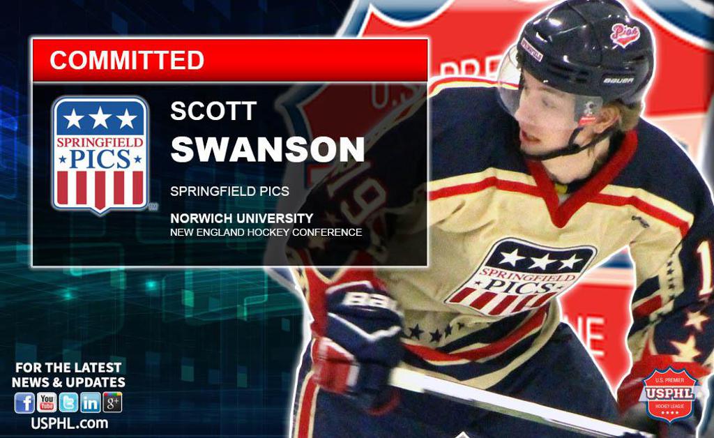“I am very excited to be attending Norwich University next year. From the hockey to the classroom, I will be challenged to excel. I would like to thank Coach Tabb and the Springfield Pics, along with my past coaches for giving me the opportunity to play at this level,” Swanson said, adding that “I'd also like to thank my parents for supporting me through this process, as this would not have been possible without them. Go Cadets.”