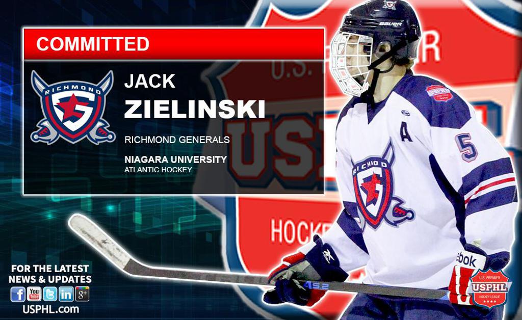 Richmond Generals Defenseman Jack Zielinski ( 6'2 200 RD RS 1996 ) commits to Niagara University . The Purple Eagles play at the NCAA Division 1 level of play in the Atlantic Hockey Conference.